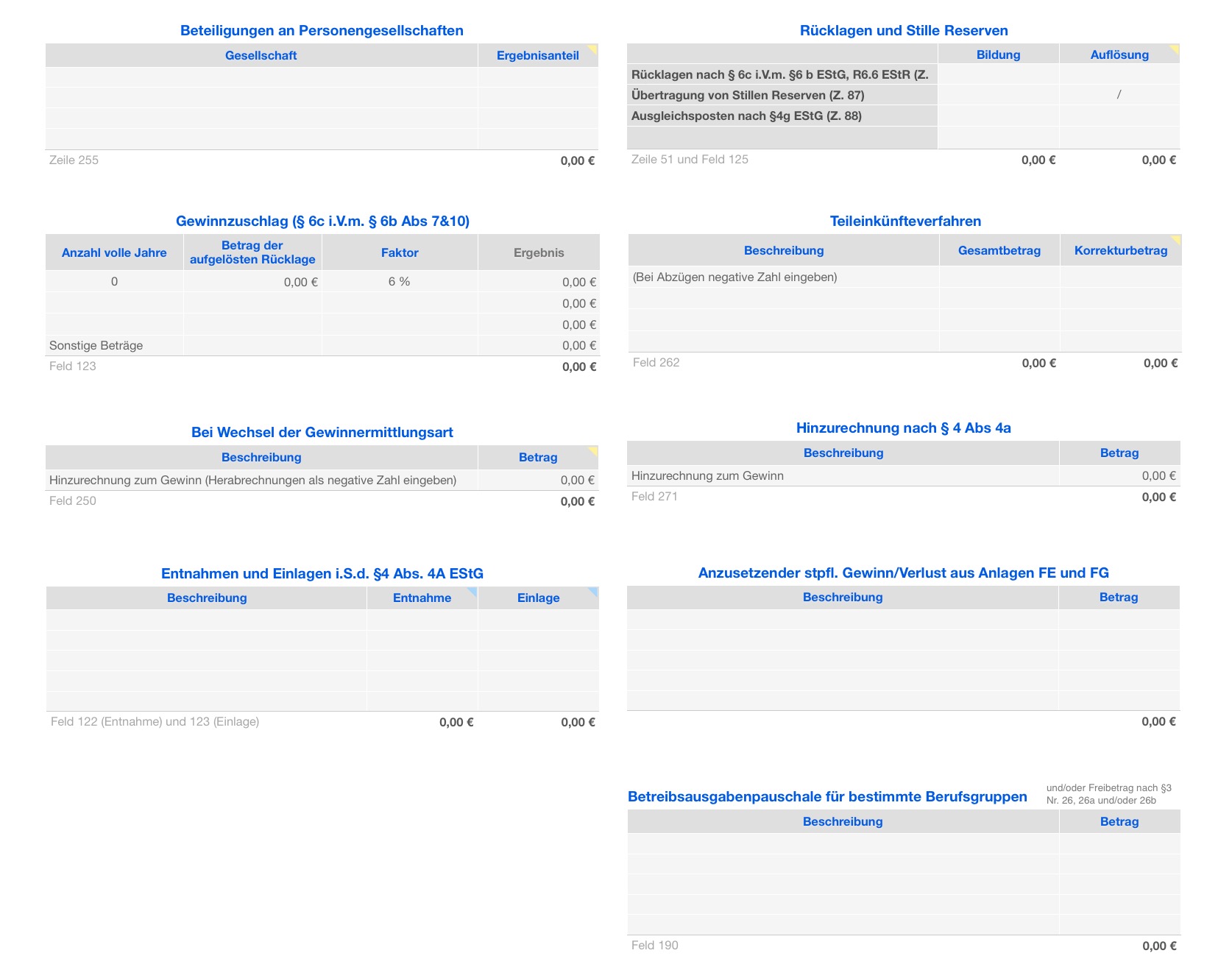 - Sonstiges: Gewinnzuschlag, Rücklagen, Beteiligungen, Teileinkünfte, Einlagen etc.