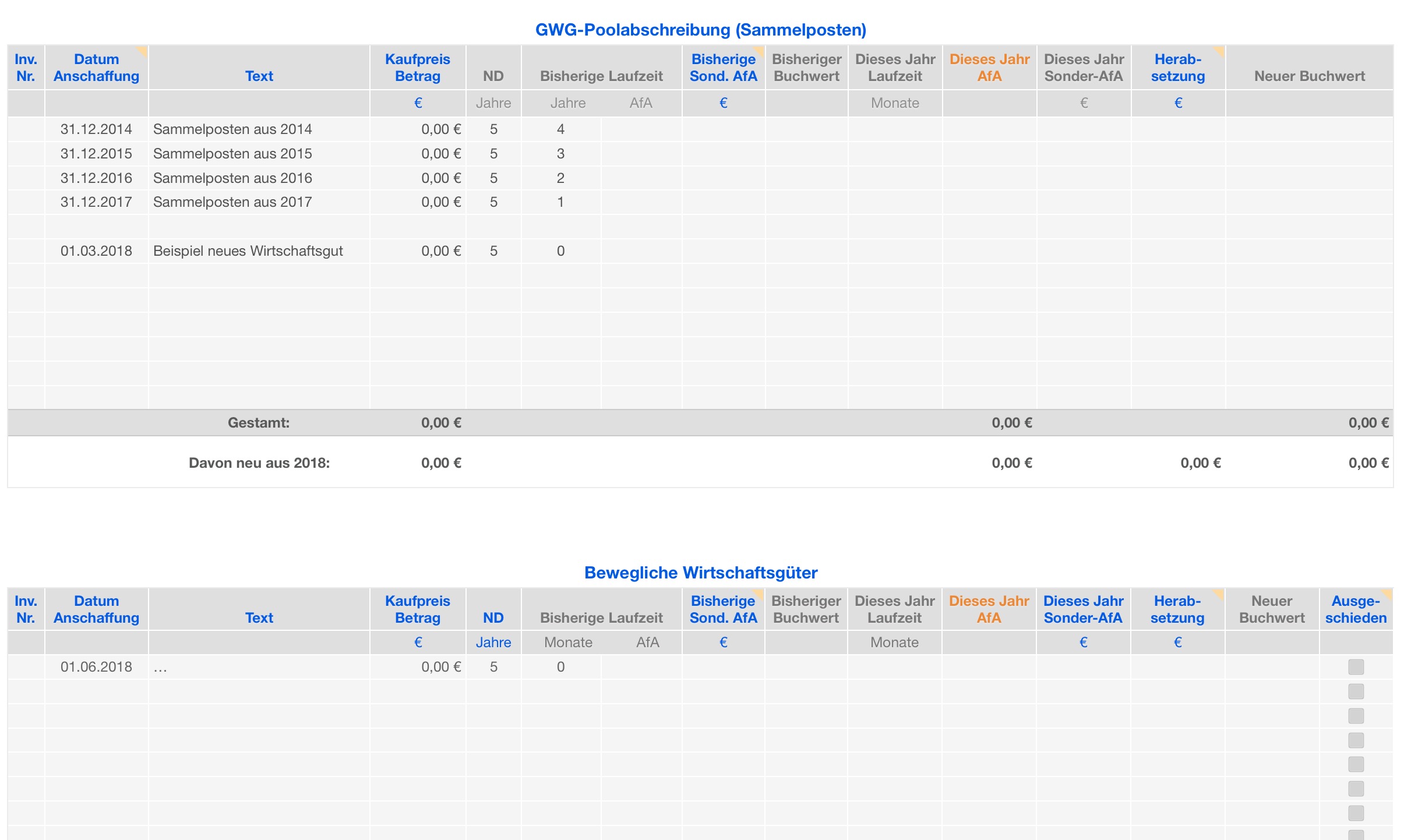 - Listen und AfA-Berechnung für GWG Sofortabschreibung und Sammelposten, bewegliche, unbewegliche und immaterielle Wirtschaftsgüter