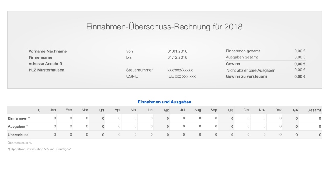 Mit der EÜR Vorlage erfassen Sie das Geschäftsjahr 2018 einfach und übersichtlich in Numbers auf dem Mac, iPad oder iPhone ohne Umsatzsteuer (Kleinunternehmer). Die EÜR mit USt finden Sie hier.