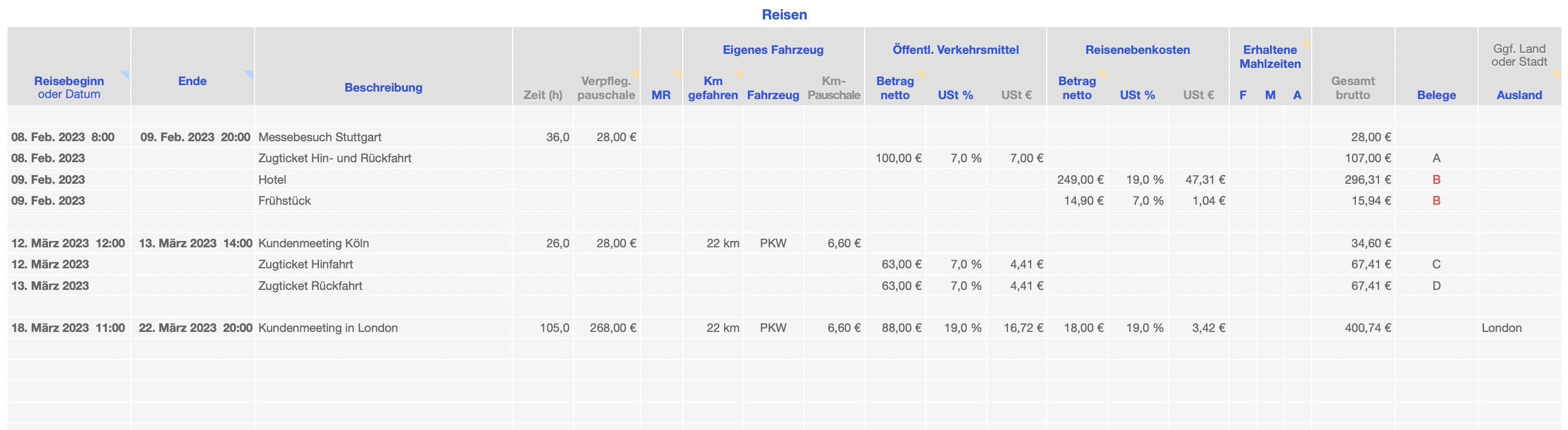 - Automatische Berechnung der Reisedauer, Fahrtkosten und Verpflegungspauschale