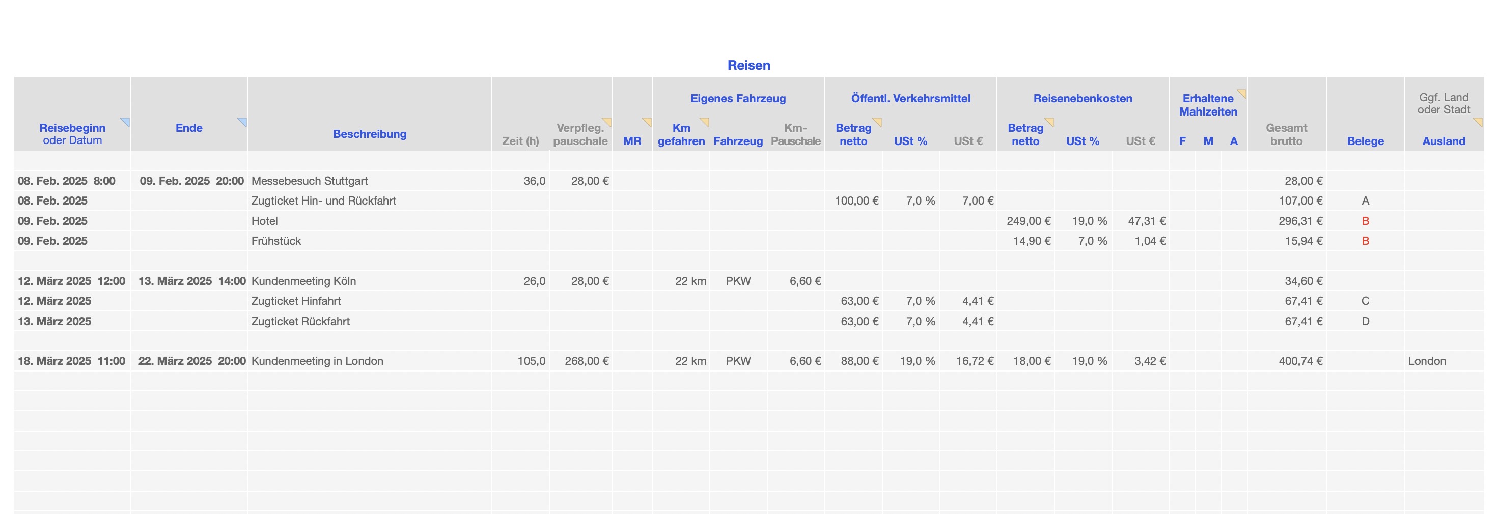 - Automatische Berechnung von Reisedauer, Fahrtkosten und Verpflegungspauschale