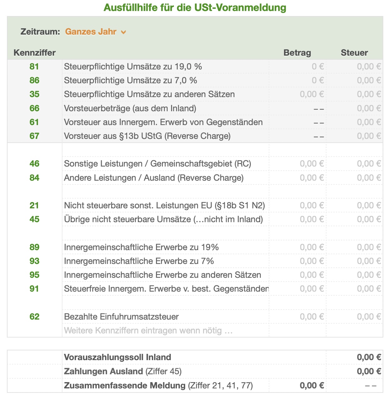 • Ausfüllhilfe für die Umsatzsteuer-Voranmeldung und Jahreserklärung mit den Kennziffern des Formulars