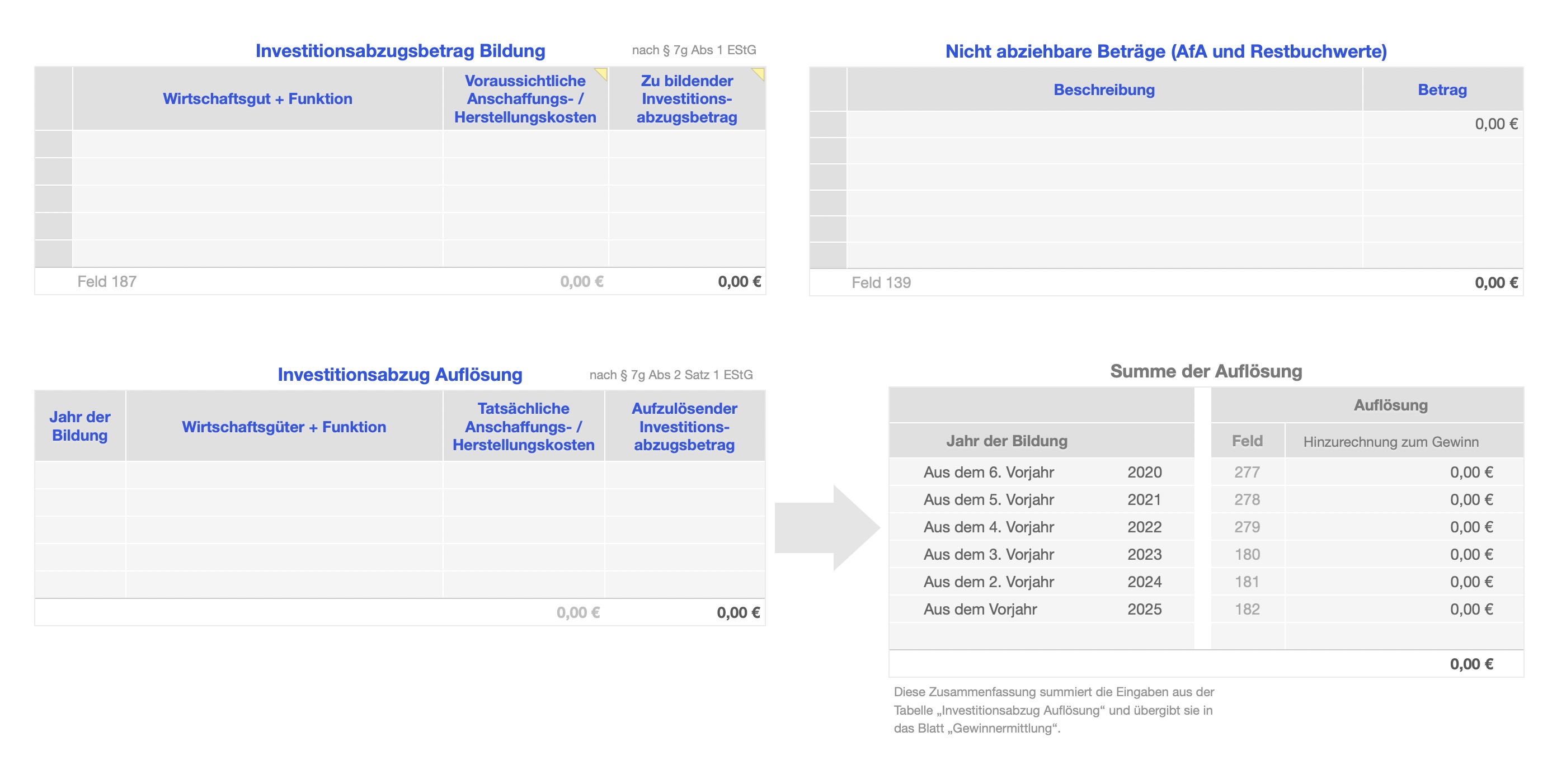 - Sonstiges: Gewinnzuschlag, Rücklagen, Beteiligungen, Teileinkünfte, Einlagen etc.