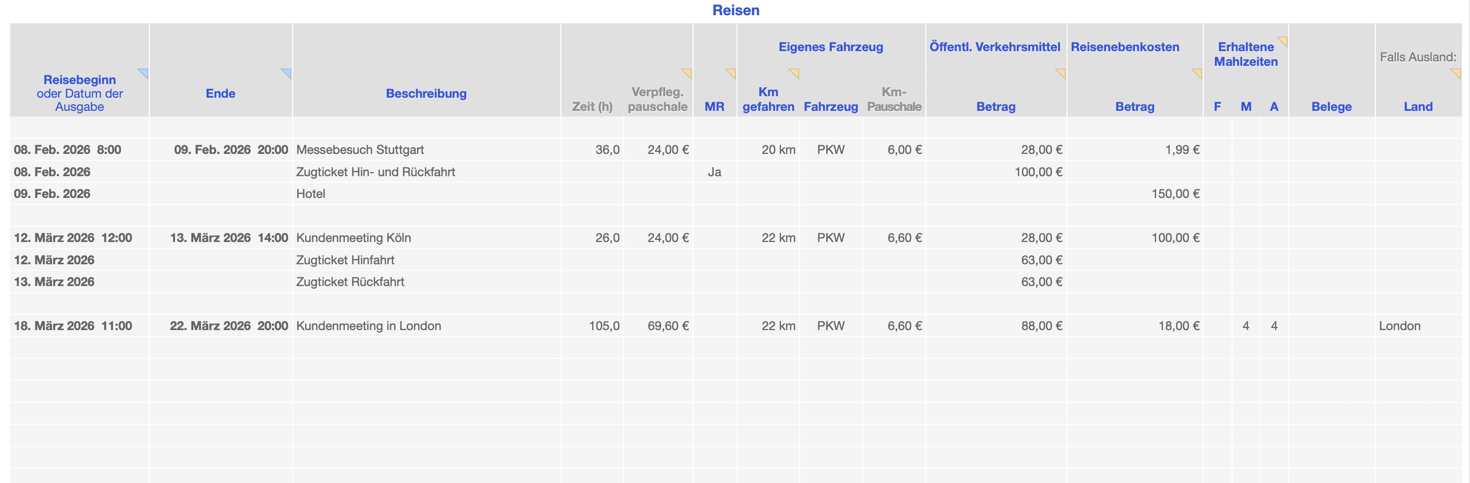 - Automatische Berechnung der Reisedauer, Fahrtkosten und Verpflegungspauschale