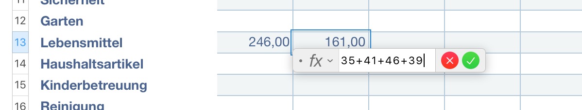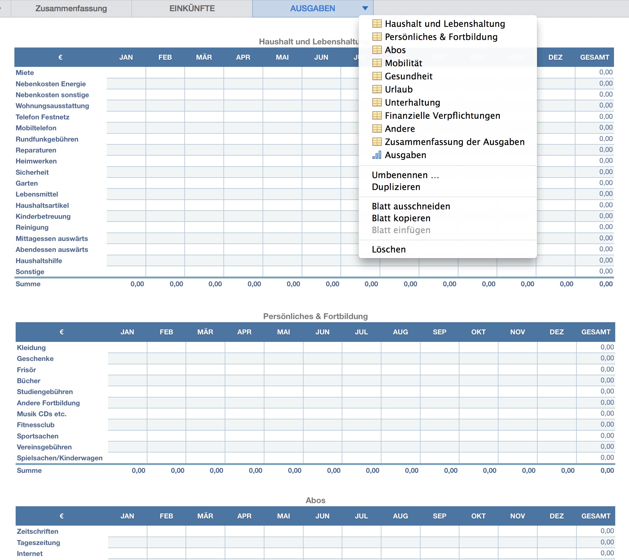 Zu den darin bereits enthaltenen Ausgaben wie Miete, Nebenkosten, Sprit, Urlaub, etc. können nach Bedarf weitere hinzugefügt werden. Fügen Sie einfach zusätzliche Zeilen ein.