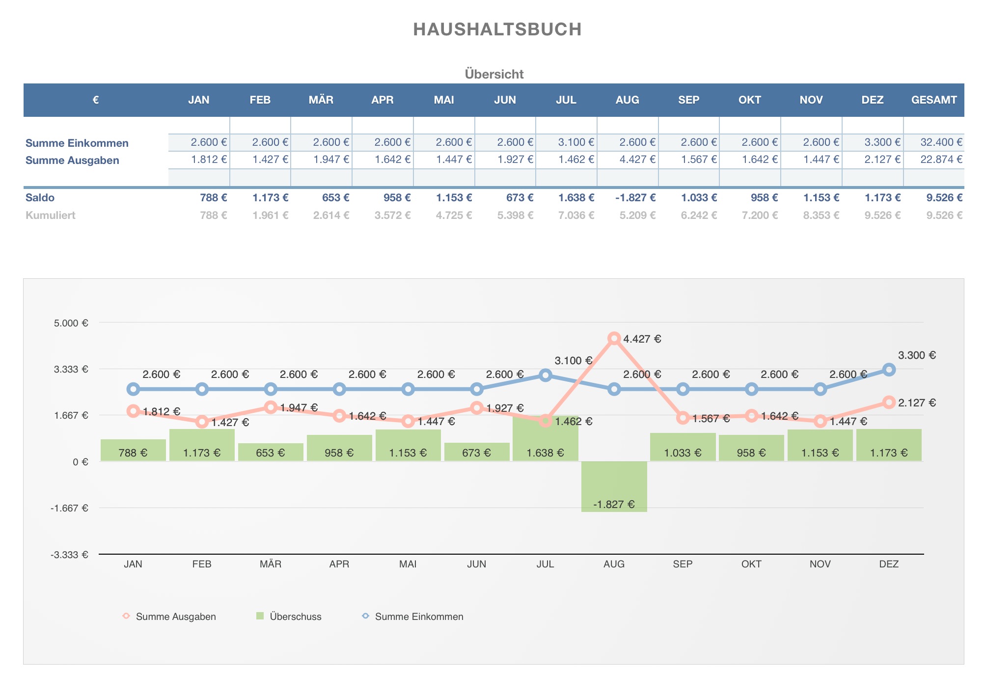 Die Vorlage macht es so besonders einfach, das Budget zu erstellen und die Einkünfte und Ausgaben von Monat zu Monat zu dokumentieren.