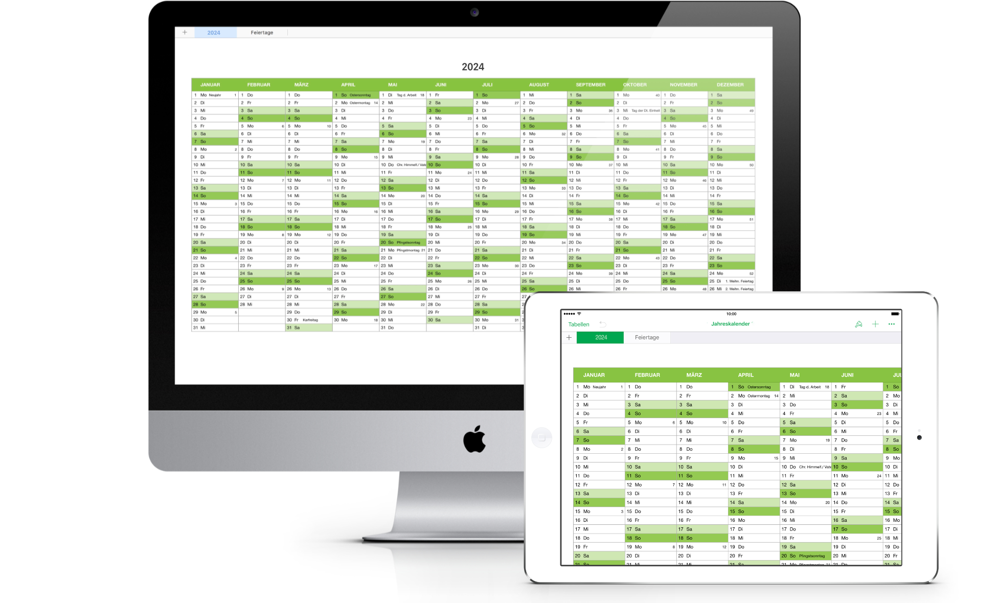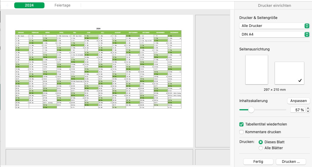Der Jahreskalender stellt das gesamte Jahr 2024 auf einem Blatt übersichtlich dar. Er lässt sich ausdrucken oder am Bildschirm nutzen und bearbeiten.