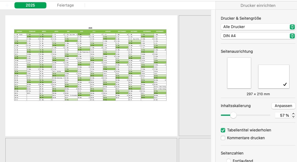 Der Jahreskalender stellt das gesamte Jahr 2025 auf einem Blatt übersichtlich dar. Er lässt sich ausdrucken oder am Bildschirm nutzen und bearbeiten.