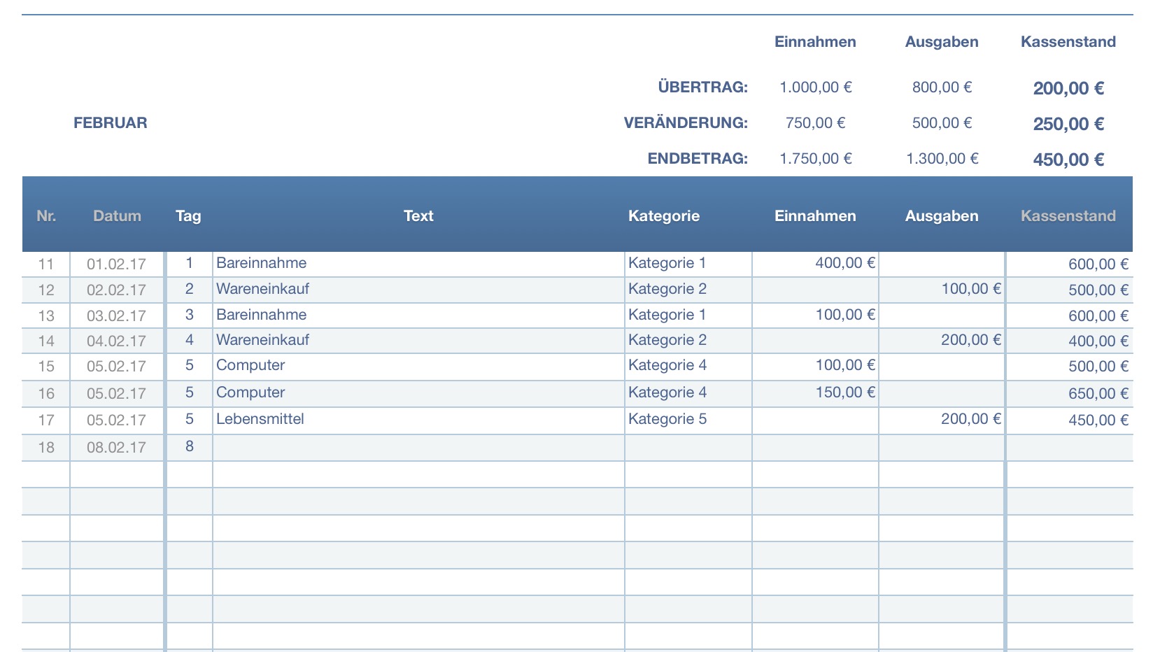 Das Kassenbuch zur Erfassung der Einnahmen und Ausgaben ohne Umsatzsteuersatz für das Jahr 2017. Für jeden Monat gibt es eine Tabelle mit 150 Zeilen, zu denen weitere hinzugefügt werden können. Jede Zeile erfasst eine Einnahme oder Ausgabe mit diesen Angaben: