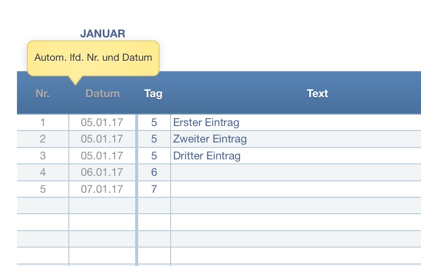 - Das Datum wird automatisch ausgefüllt, z.B. "22" für den 22.06.2017