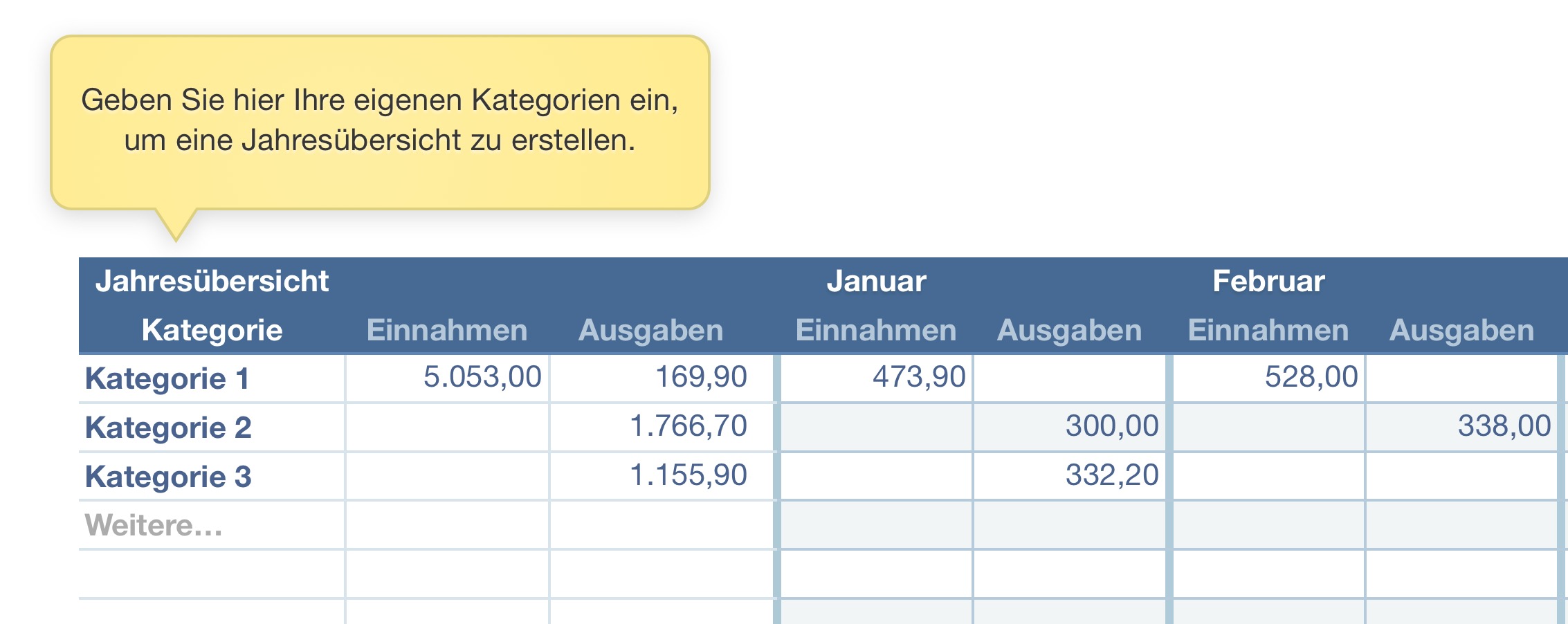 Es steht ebenfalls eine detailliertere Auswertung nach Kategorien und Monaten zur Verfügung. Kategorien können verwendet werden, um eine bessere Übersicht zu erhalten. In der Auswertung stehen dafür 15 Zeilen für je eine Kategorie zur Verfügung. Es können weitere hinzugefügt werden. Tragen Sie dort Ihre Kategorien oder Konten ein, die Sie bei der Erfassung verwenden. Diese werden dann nach ihrer monatlichen Summe dargestellt.