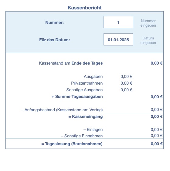 - Tagesliste mit jeweiligen Anfangs- und Endstand der Kasse für einen gesamten Monat