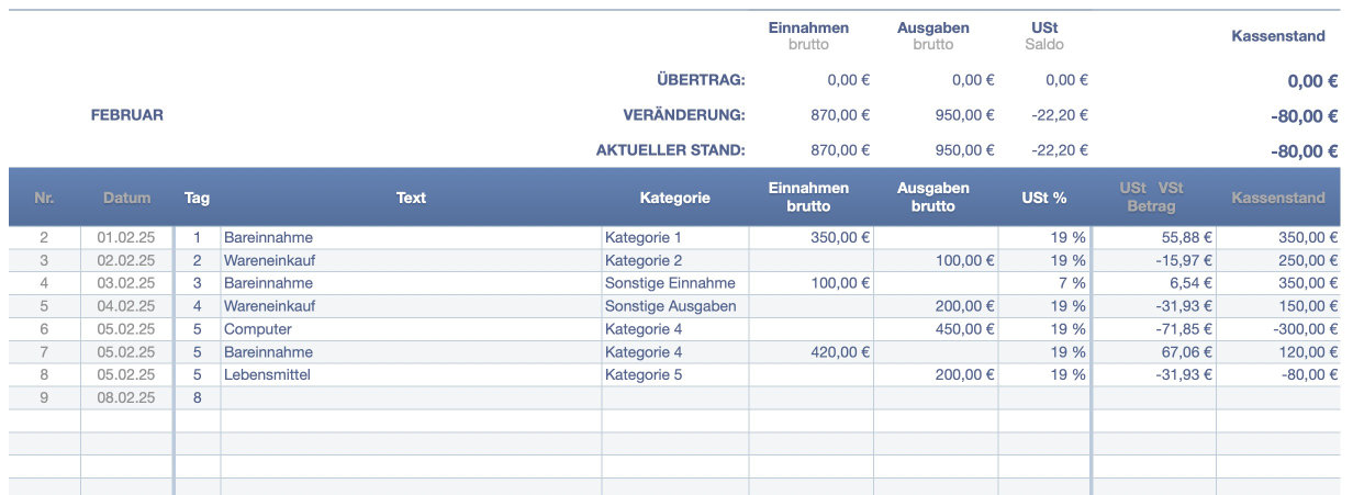 Jeder Monat zeigt übersichtlich die Summe der Einnahmen, Ausgaben, Umsatzsteuer und den Kassenbestand zeilengenau an. Die Salden und Zeilennummern werden in den nächsten Monat übertragen. Es können bis zu drei unterschiedliche USt-Sätze verwendet werden, z.B. 19%, 7% und 0% oder auch 20%, 10% und 0%.