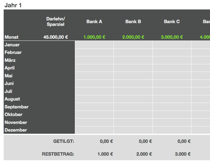 Einfach zu bedienende Vorlage zur Tilgung (oder Ansparung) einer bestimmten Summe über insgesamt 9 Konten. Der Plan geht über 10 Jahre (Jan. bis Dez.). Die Zwischensummen am Jahresende werden automatisch auf das neue Jahr übertragen.