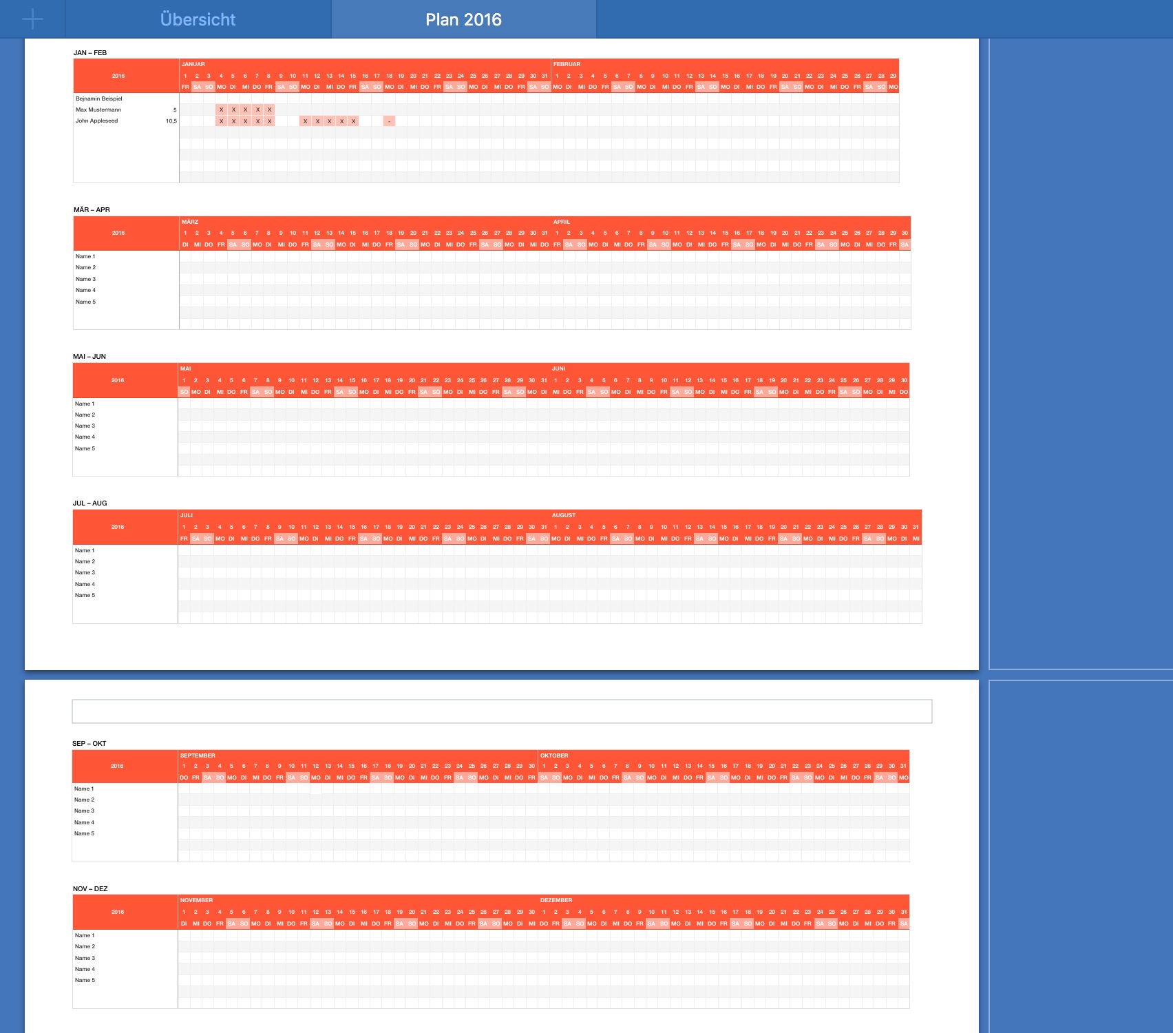 Alle 12 Monate werden auf einem Blatt in 6 Tabellen (je 2 Monate) untereinander dargestellt, um sie im Querformat ausdrucken zu können.