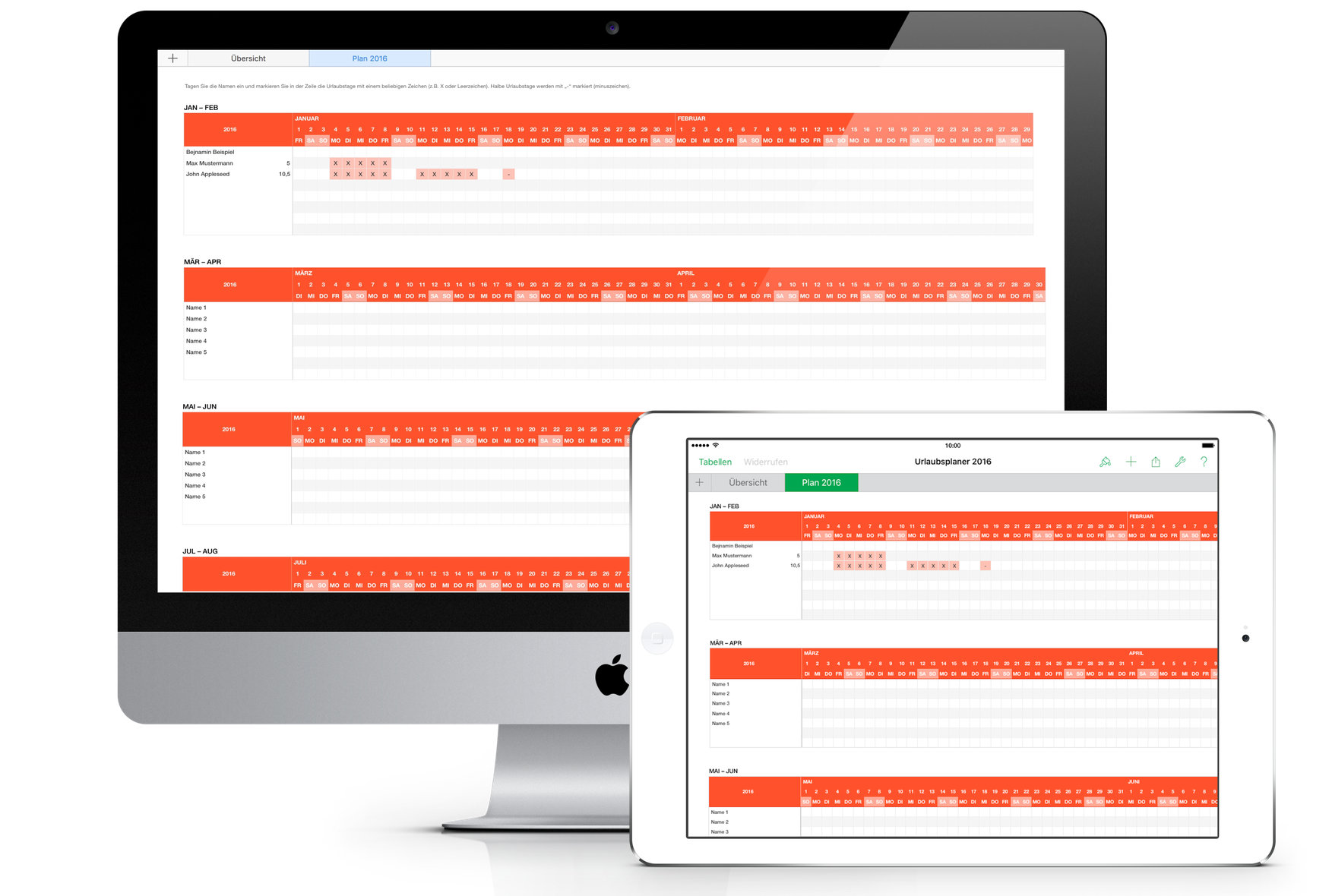 Tragen Sie den Namen ein und markieren Sie die Zellen der Urlaubstage mit einem beliebigen Zeichen, z.B einem X oder einem Leerzeichen. Die markierten Tage werden farbig hinterlegt.