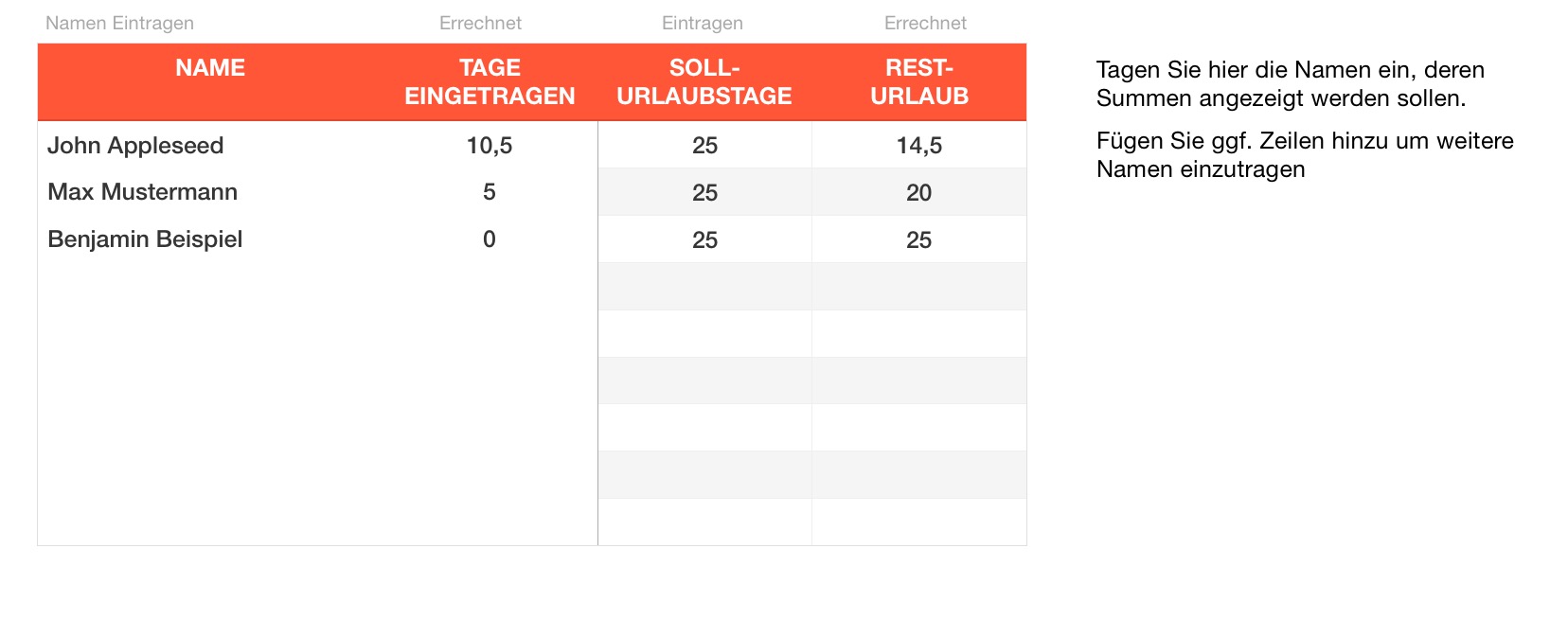 Die Vorlage enthält ebenfalls eine Liste der Urlaubstage in Deutschland (bundesweit und nach Bundesländern).