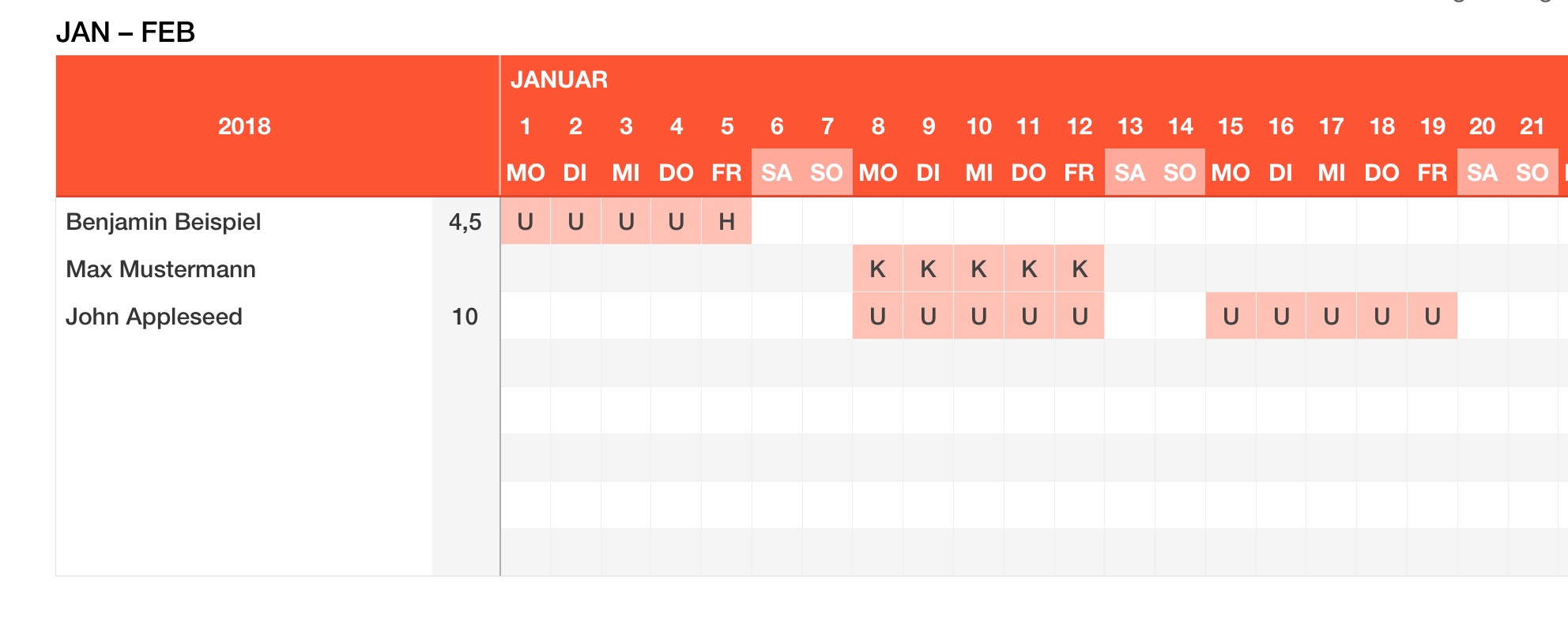 Tragen Sie den Namen ein und markieren Sie die Urlaubstage mit einem U oder X oder einem Leerzeichen. Diese werden als volle Urlaubstage gezählt. Halbe Urlaubstage können mit H oder - (Minuszeichen) gekennzeichnet werden. Diese zählen 0,5 Urlaubstage.