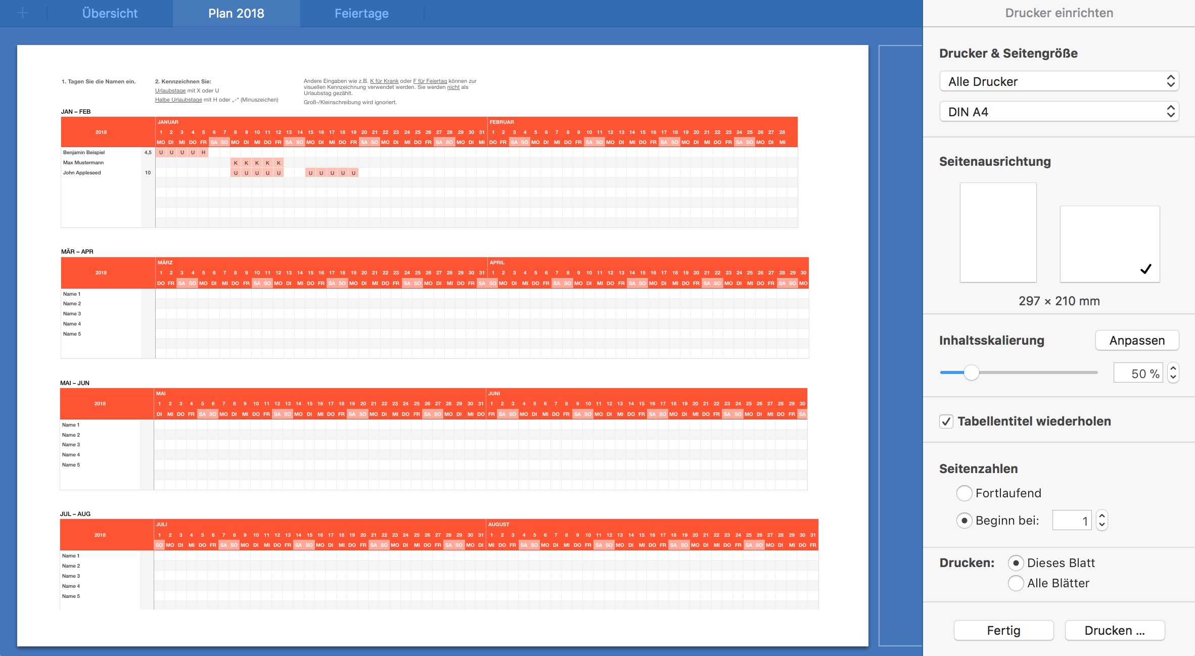 Alle 12 Monate werden auf einem Blatt in 6 Tabellen (je 2 Monate) untereinander dargestellt, um sie im Querformat ausdrucken zu können.