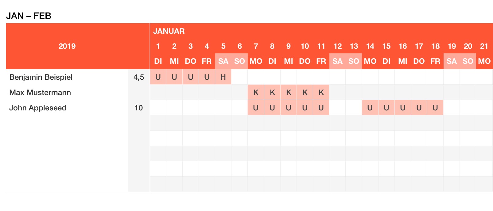 Tragen Sie den Namen ein und markieren Sie die Urlaubstage mit einem U oder X oder einem Leerzeichen. Diese werden als volle Urlaubstage gezählt. Halbe Urlaubstage können mit H oder - (Minuszeichen) gekennzeichnet werden. Diese zählen 0,5 Urlaubstage.
