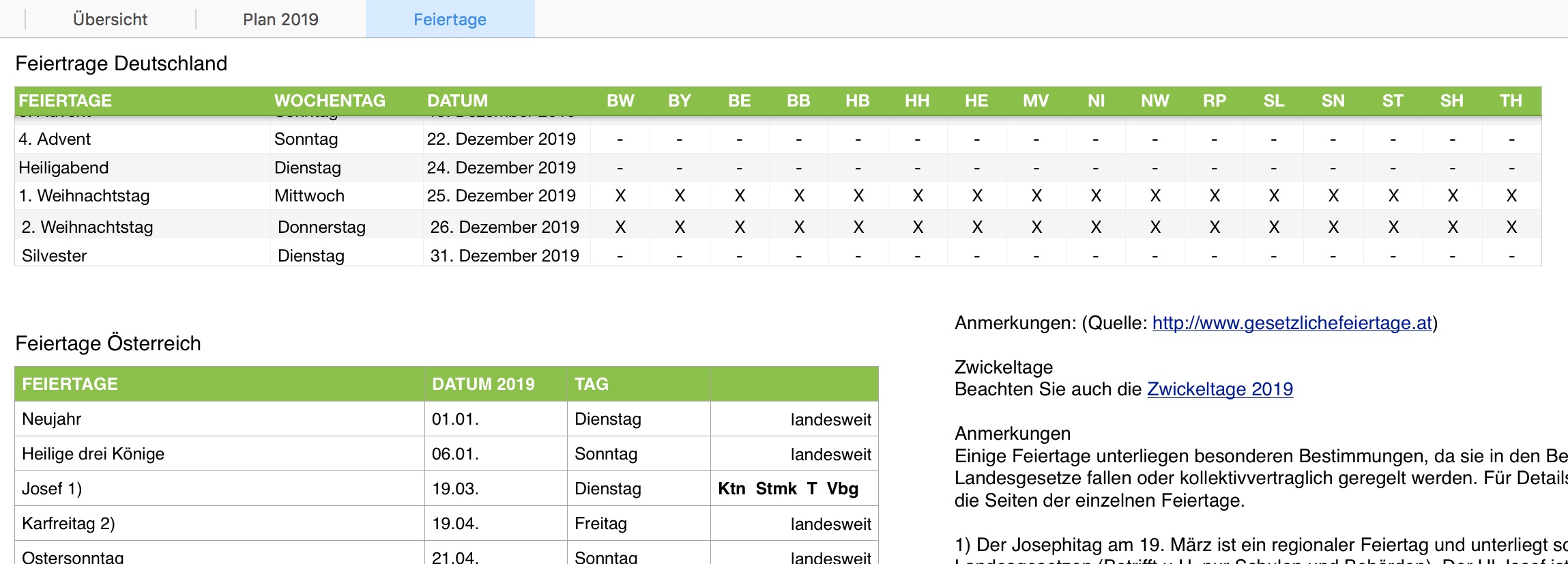 Die Vorlage enthält ebenfalls eine Liste der Urlaubstage in Deutschland (bundesweit und nach Bundesländern), Österreich und Schweiz.