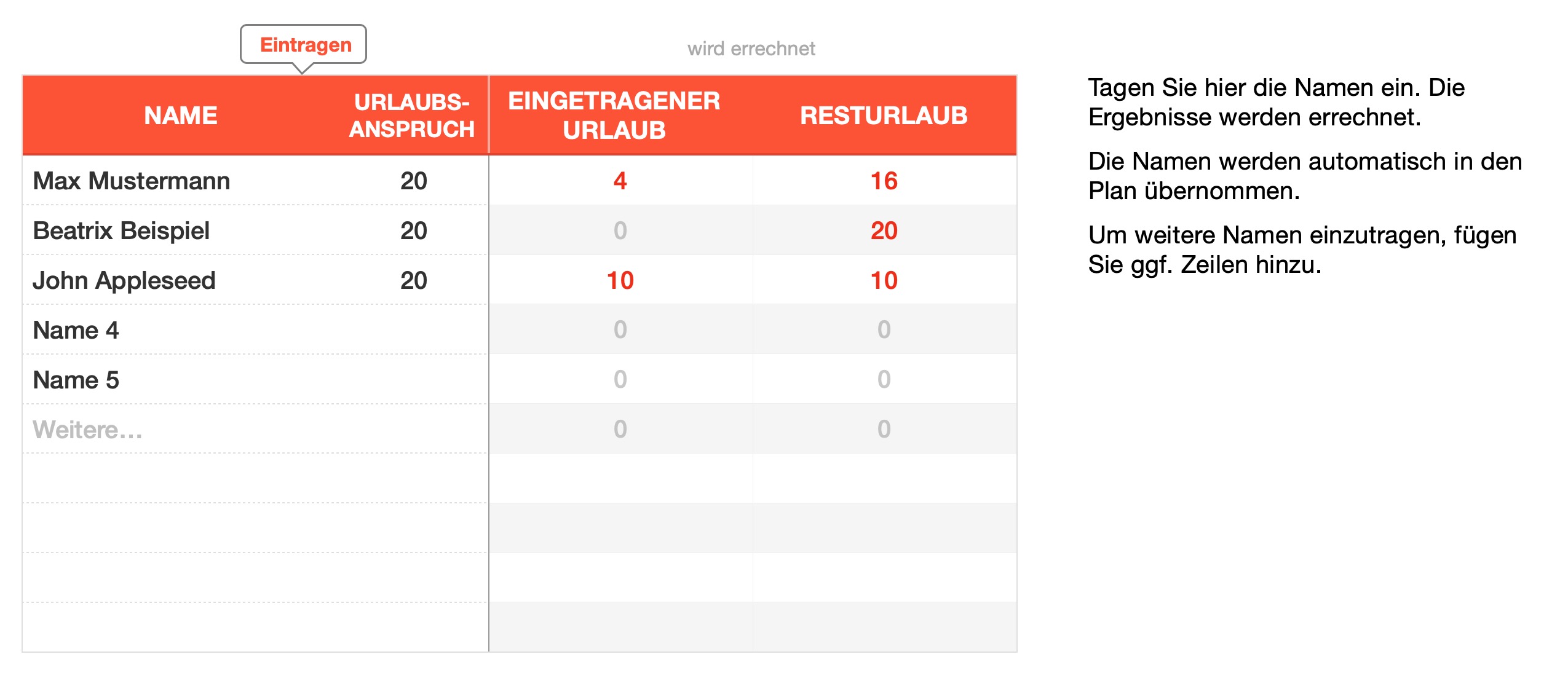 Tragen Sie den Namen ein und markieren Sie die Urlaubstage mit einem U oder X oder einem Leerzeichen. Diese werden als volle Urlaubstage gezählt. Halbe Urlaubstage können mit H oder - (Minuszeichen) gekennzeichnet werden. Diese zählen 0,5 Urlaubstage.