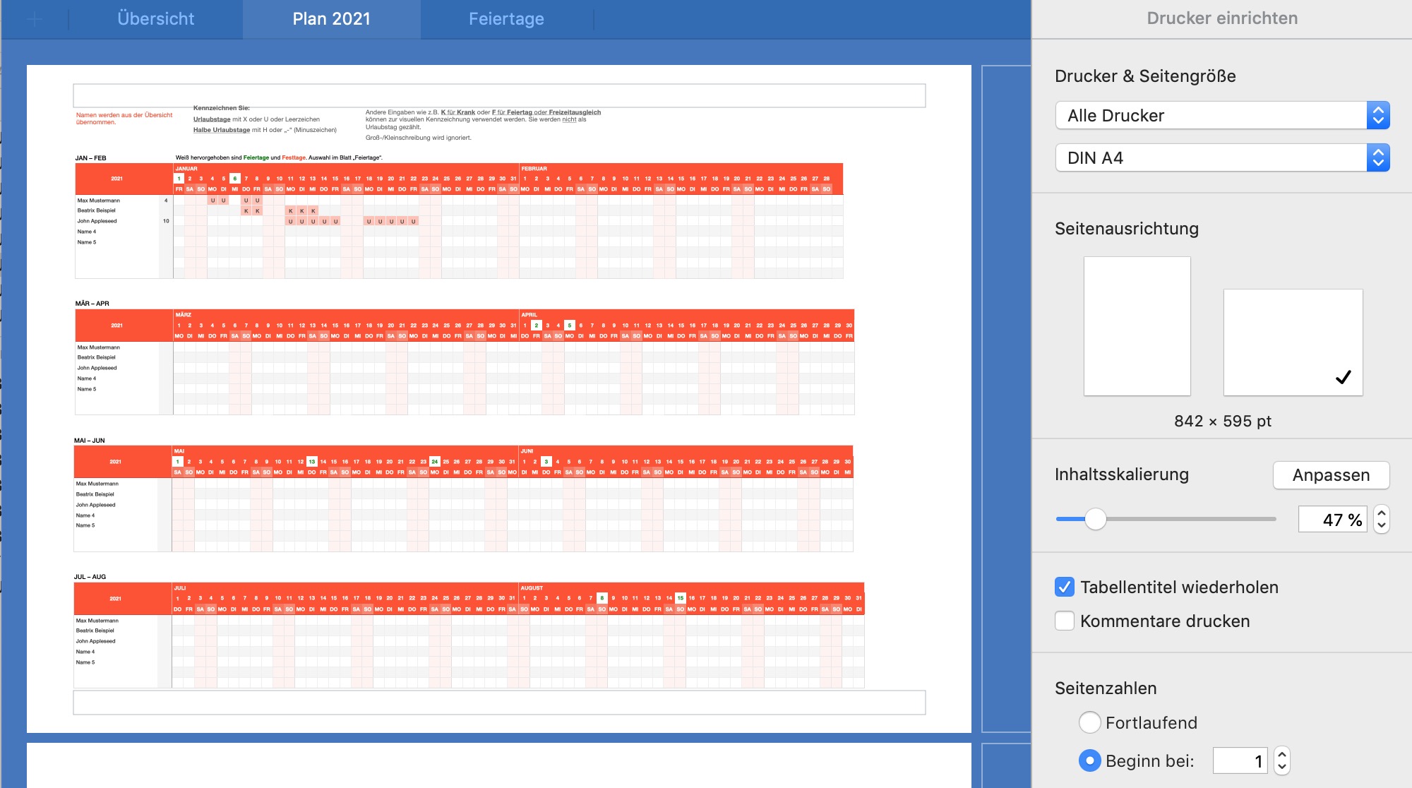 Alle 12 Monate werden auf einem Blatt in 6 Tabellen (je 2 Monate) untereinander dargestellt, um sie im Querformat ausdrucken zu können.