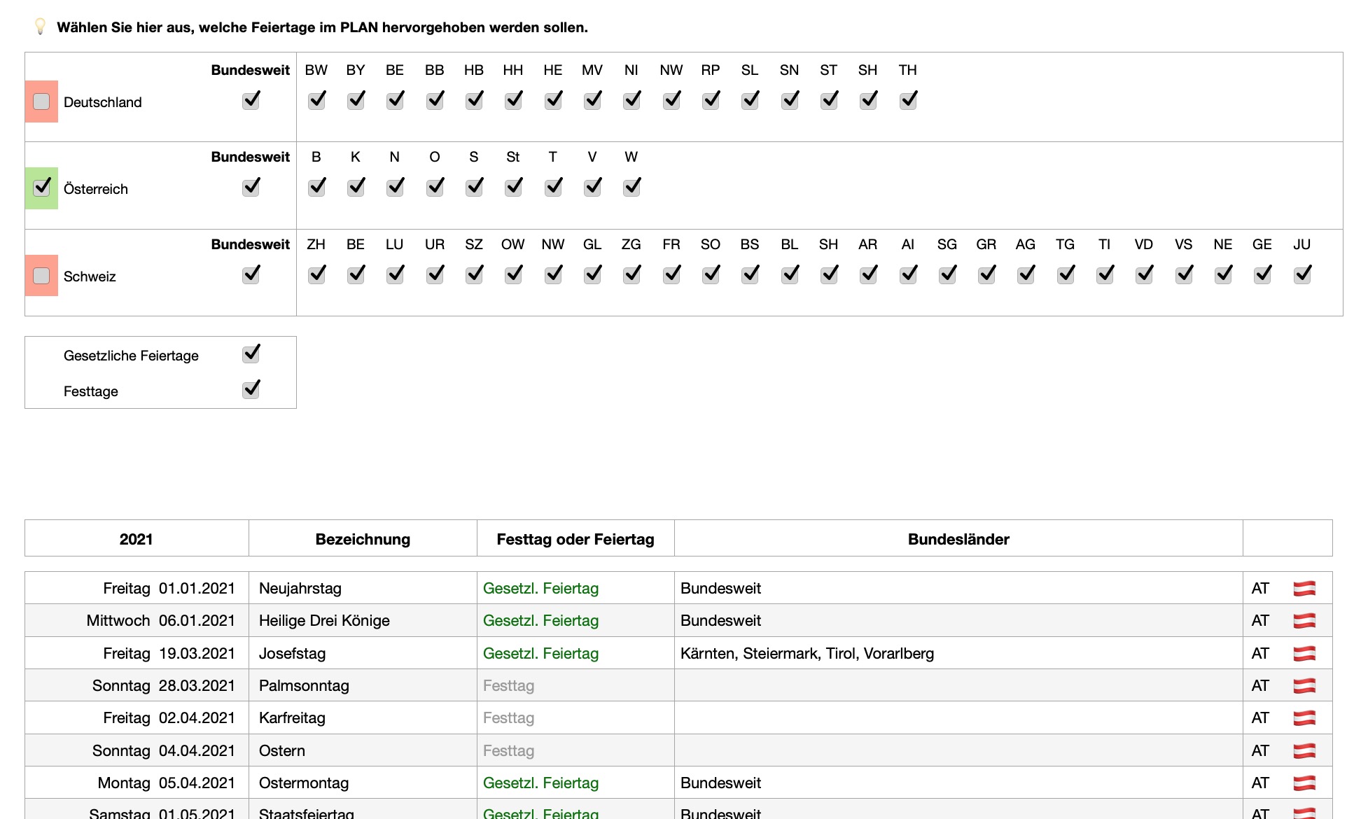 - Auswahl der gewünschten Feiertage und Festtage und Anzeige in der Planung
