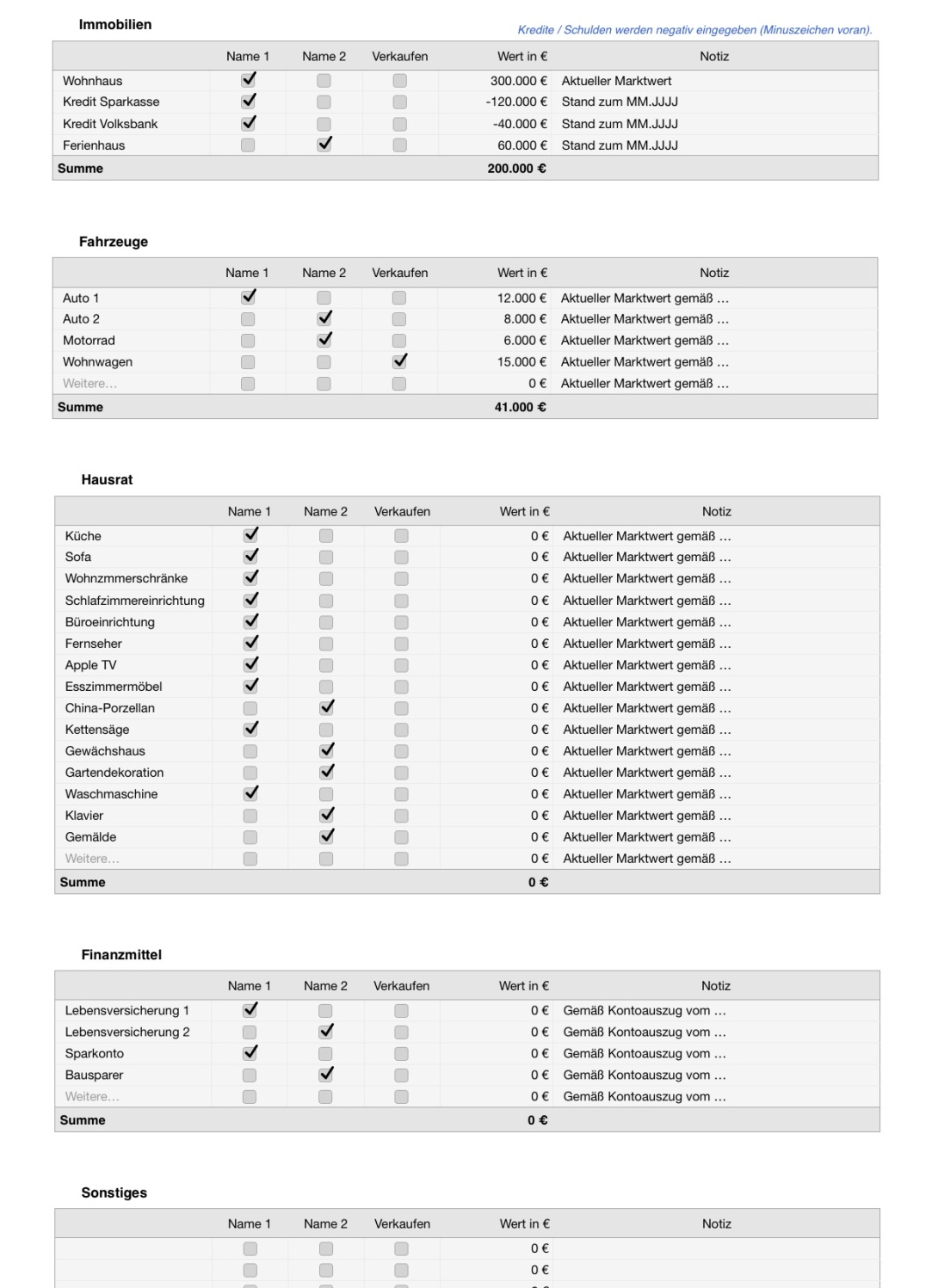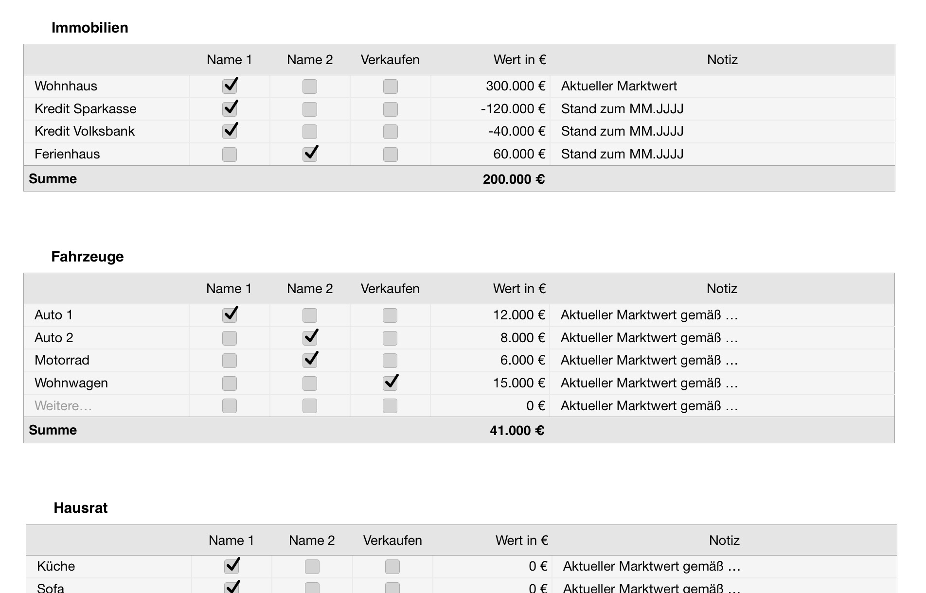 Die Tabellen erleichtern es, alle Vermögenswerte strukturiert zu erfassen und eine Übersicht zu erhalten, beispielsweise für eine Trennungsvereinbarung.
