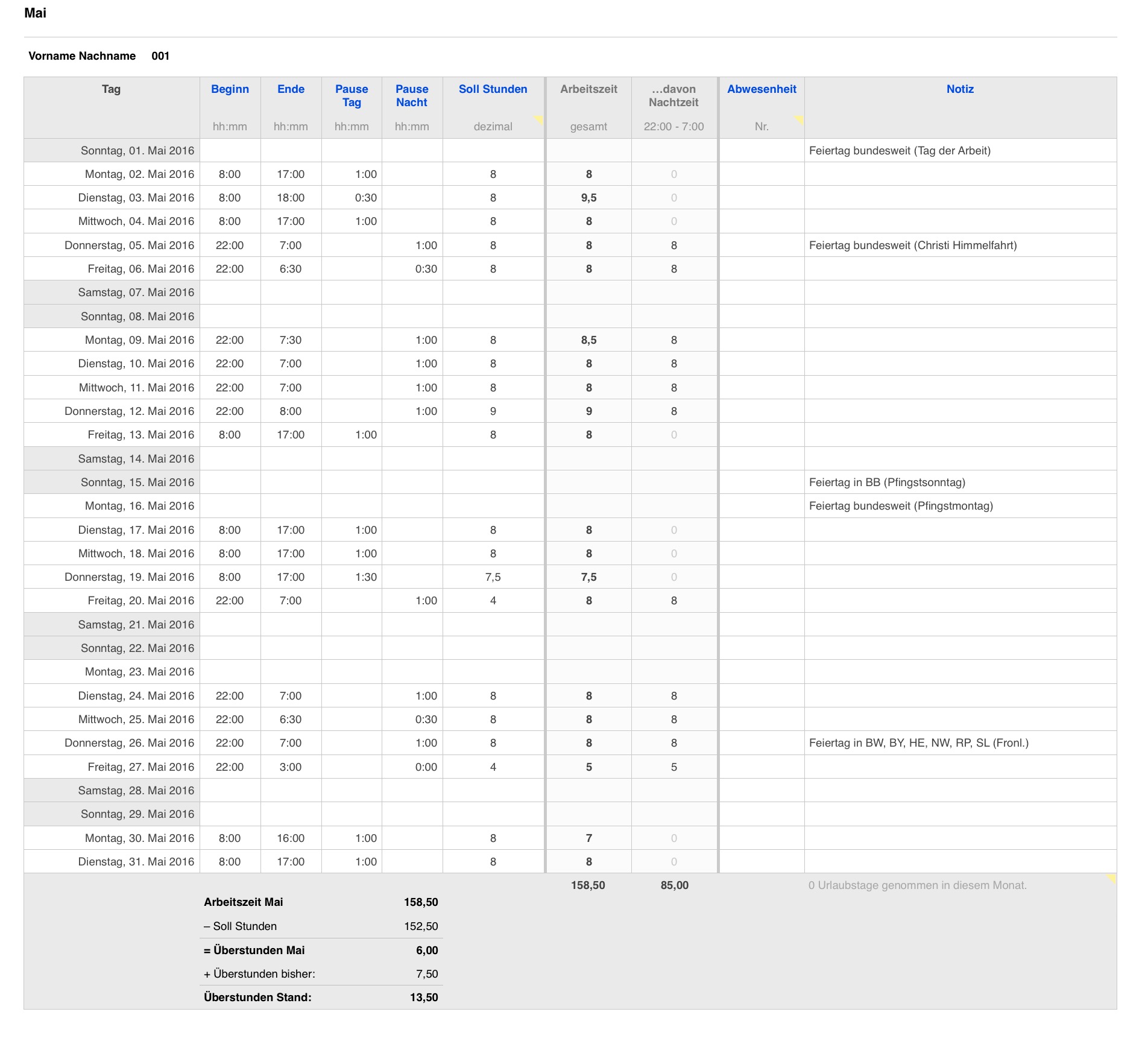 Die tägliche Arbeitszeit wird mit der anteiligen Nacht-Zeit errechnet. Die Überstunden im aktuellen Monat sowie die insgesamt aufgelaufenen Überstunden sind auf jedem Blatt übersichtlich dargestellt.