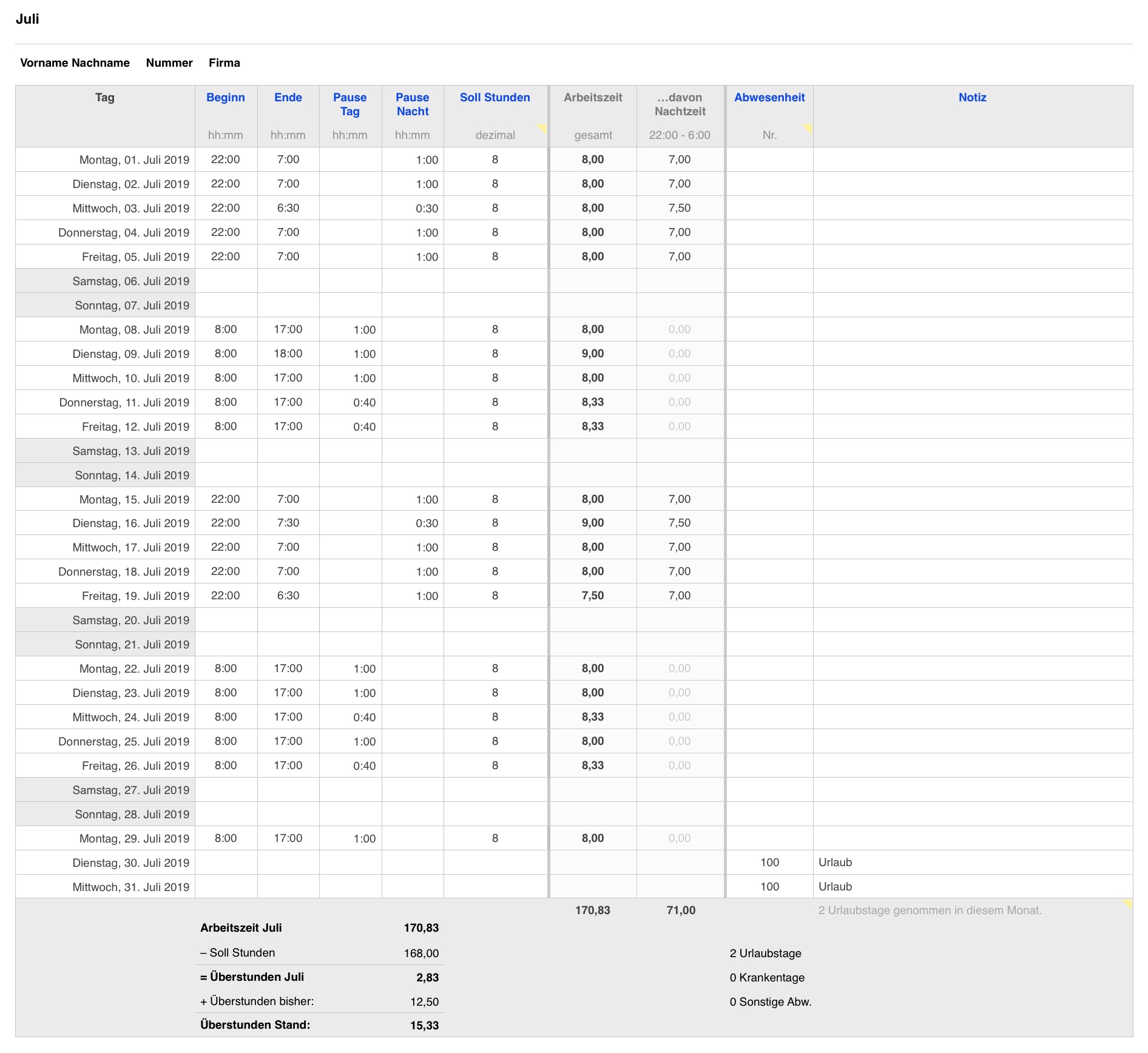 Die tägliche Arbeitszeit wird mit der anteiligen Nacht-Zeit errechnet. Die Überstunden im aktuellen Monat sowie die im Jahr aufgelaufenen Überstunden sind auf jedem Blatt dargestellt.