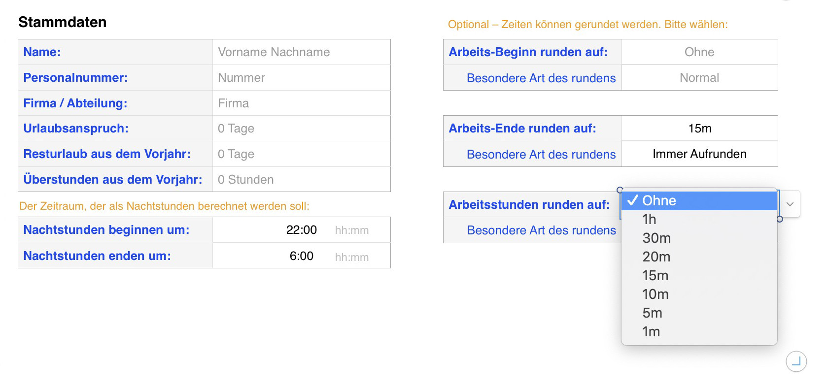NEU Runden: Die Zeiten können gerundet werden. Sowohl die Beginn- als auch die End-Zeiten sowie die Tagesarbeitszeit. Diese Einstellung kann in den Stammdaten gesetzt werden.