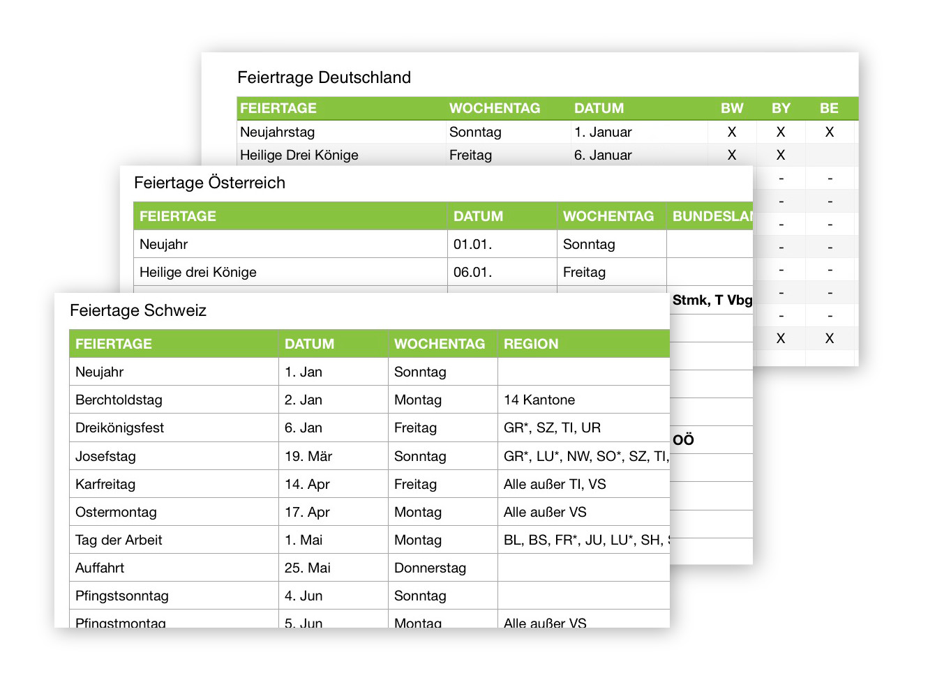 Feiertage sind mit Hinweis auf die betreffenden Bundesländer in Deutschland eingetragen. Zusätzlich sind für Deutschland, Österreich und die Schweiz Feiertage in einer eigenen Übersicht aufgelistet.