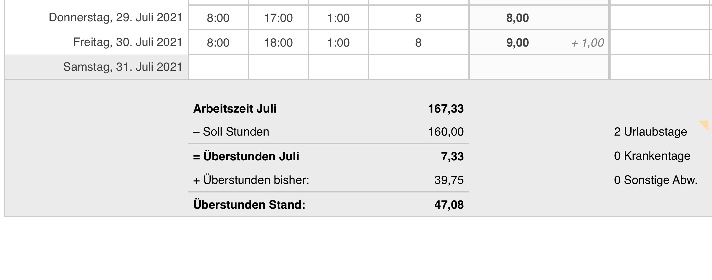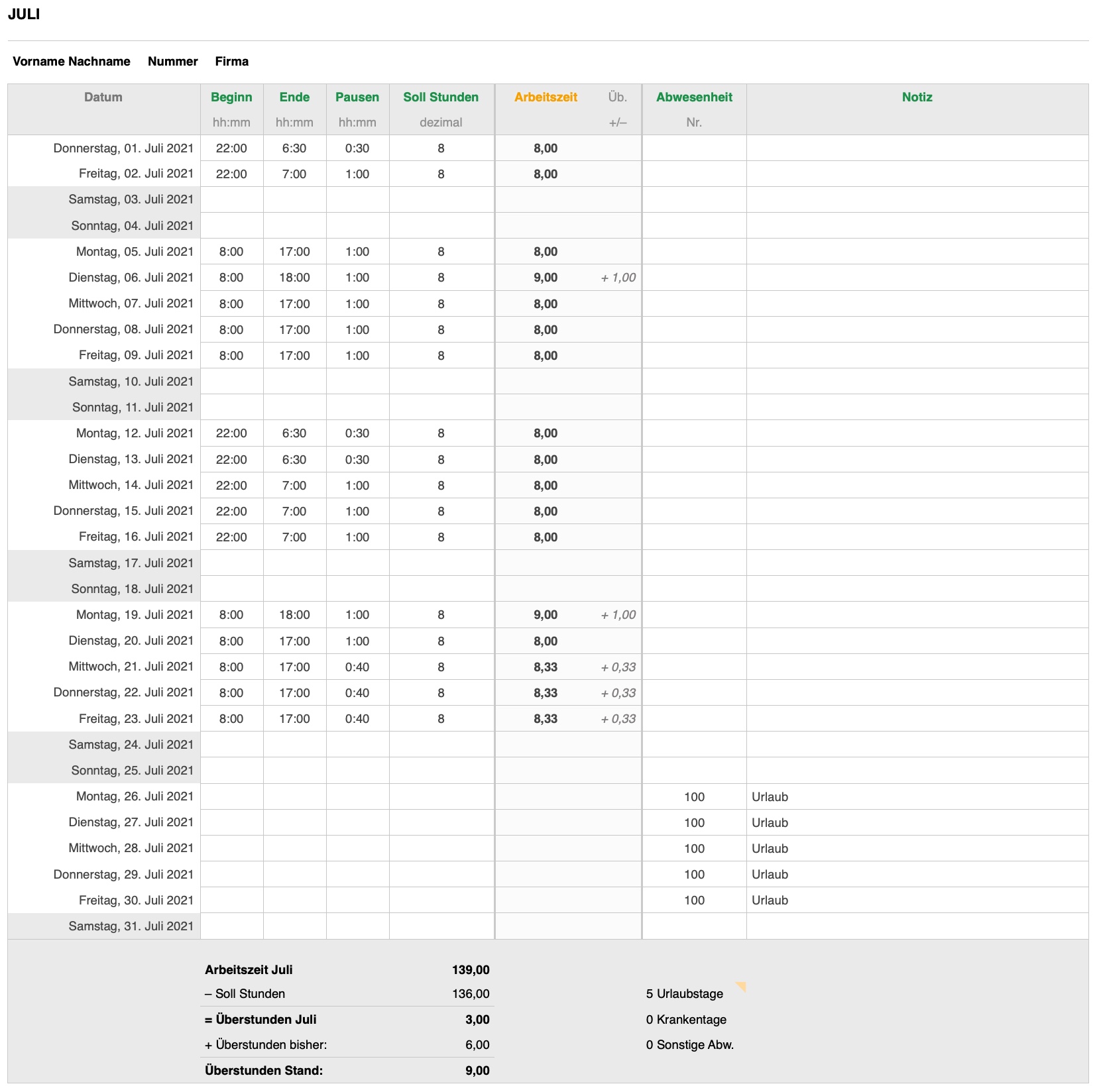 - die Anzahl der eingetragenen Urlaubstage und Krankheitstage (je Monat und ganzes Jahr)
