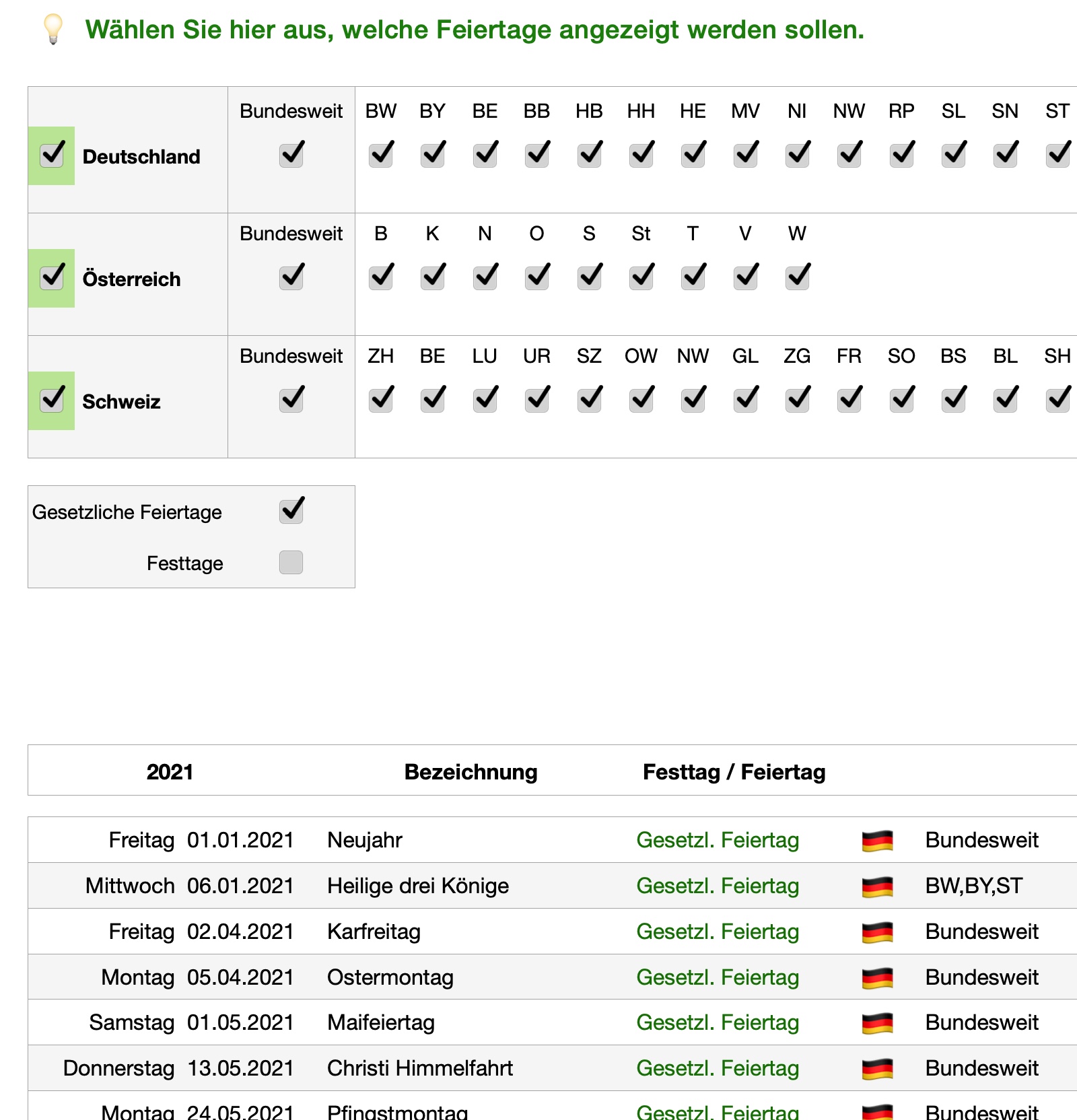 Feiertage sind mit Hinweis auf betreffende Bundesländer für Deutschland an dem jeweiligen Tag bereits eingetragen. Alle Feiertage für Deutschland, Österreich und die Schweiz sind in einer eigenen Übersicht aufgelistet.