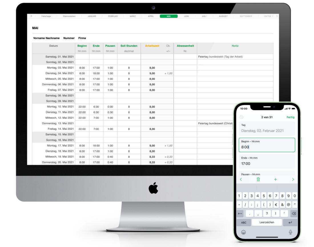 Pro Tag ist eine Zeile mit Datum vorgegeben. Jeder Monat ist auf einem eigenen Blatt mit übersichtlicher Summe der Arbeitszeit, Überstunden und Urlaubstage.