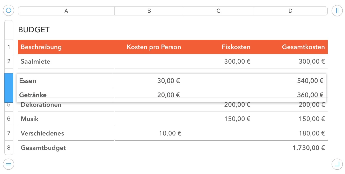 Eine Tabelle besteht aus Zeilen und Spalten. Zeilen, Spalten und einzelne Zellen können innerhalb einer Tabelle und zwischen Tabellen bewegt werden. Um z.B. eine oder mehrere Zeilen zu verschieben, markiert man sie am Zeilenkopf und zieht sie zur gewünschte Stelle.