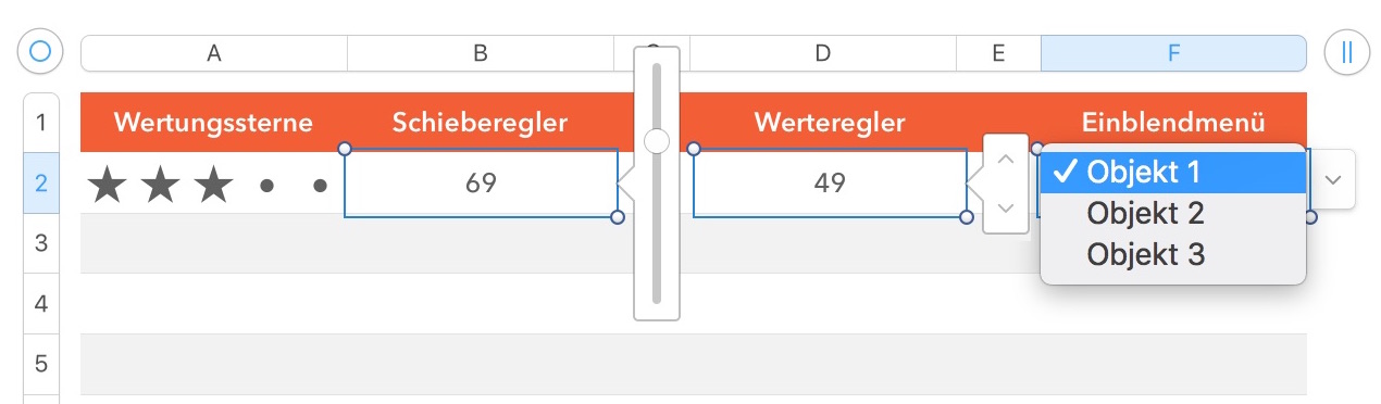 • Schieberegler – Um Zahlenwerte mit der Maus zu verändern, kann man den Schieberegler verwenden. Der Regler lässt sich verschieben womit sich der Wert in der Zelle erhöht oder verringert. Man kann das Maximum, Minimum und das Intervall festlegen sowie das angezeigte Zahlenformat (Euro, Prozent etc.) mit Ausnahme von Zeit und Dauer.